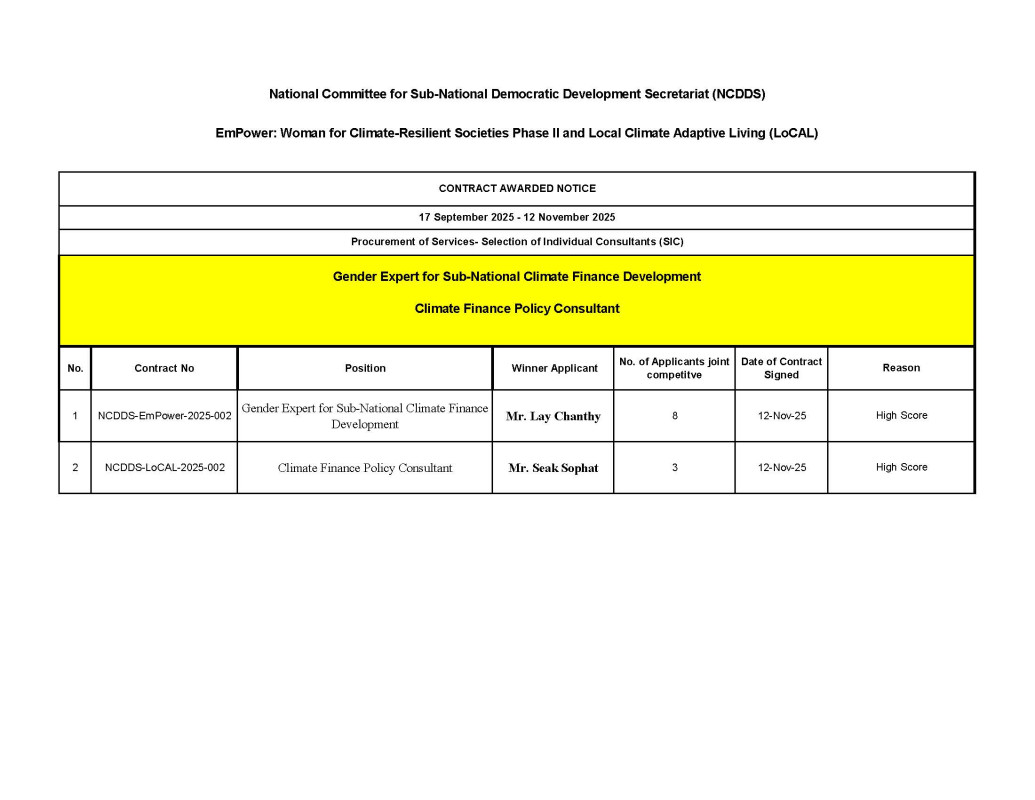 Contract Awarded Notice 2 Position: Gender Expert for Sub-National Climate Finance and Climate Finance Policy Consultant